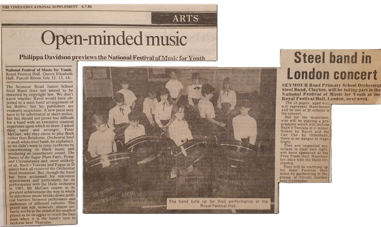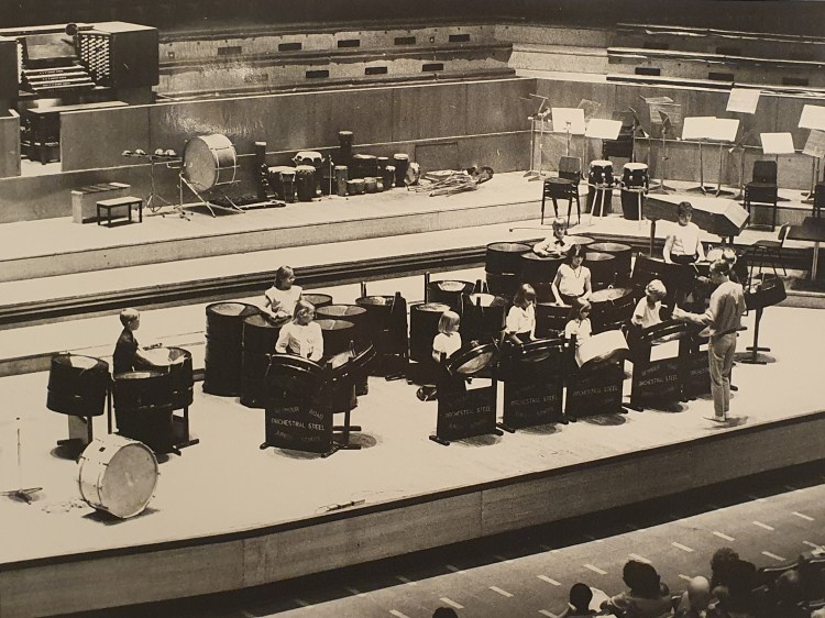 Over this period they established a reputation as one of the leading school steel bands in the country – noted for their performance and interpretation of the orchestral repertoire. Peter McGarr was nominated as ‘Music Teacher of the Year’ in 1986 and went on to achieve the British Composer Award and George Butterworth Award for Contemporary Music.